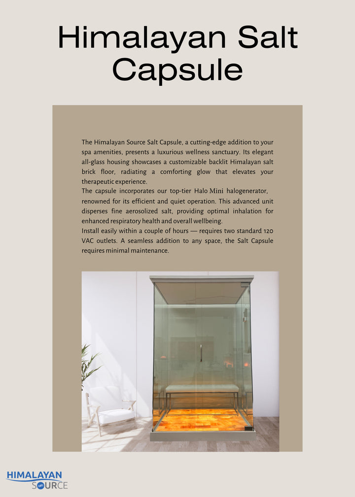 Create a spa-level halotherapy experience in your own space with the Himalayan Source Salt Capsule. Designed for one or two people, this sleek, all-glass capsule transforms any home, gym, or wellness area into a private Himalayan salt sanctuary.